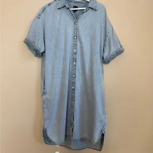 Light wash dress that buttons down with pockets. Relaxed fit, a closet staple! perfect western, pumpkin patch, fall dress to wear with boots