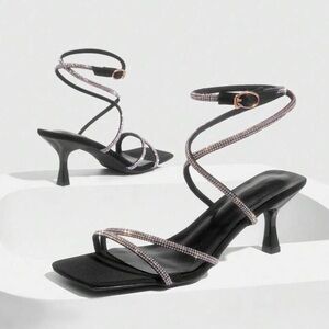 Elegant black strappy heels featuring sparkling rhinestone detailing. Perfect for a night out.