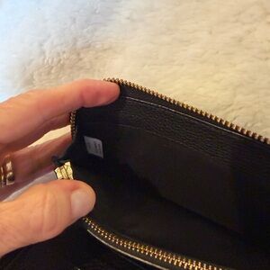Tory Burtch Black textured leather zip around continental wallet. Inside zip pouch. 8 card slots, one gusset pouch and one slip pouch! Only callout is rubbing to metal front logo otherwise excellent condition