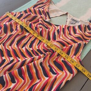 Vibrant and flattering DKNY sleeveless dress featuring a bold orange, navy, and pink wave print. Designed with a soft cowl neckline and elastic waist that flows into a pleated skirt for movement and shape. A statement keyhole back adds interest while keeping it polished and wearable.