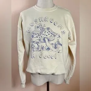 Super cute cozy graphic sweatshirt from Urban Outfitters featuring a whimsical mushroom fairy illustration with “Mushrooms R Cool” text. Soft fleece interior with a relaxed, comfy fit — perfect for layering, lounging, or styling with jeans for a casual cottagecore vibe.