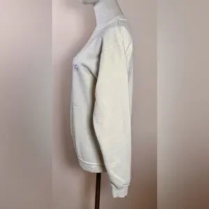 Cream base with blue graphic print. Crew neckline, long sleeves, and ribbed cuffs and hem.