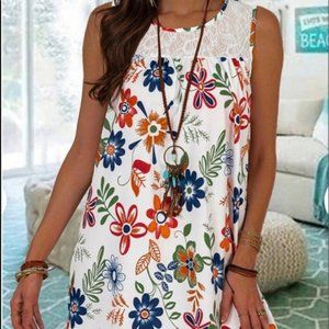 ! NWT Women's White & Multi Floral Lace Yoke Sleeveless Shift Mini Dress !
