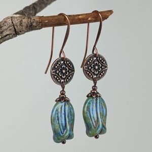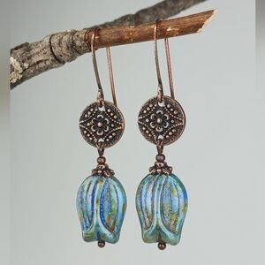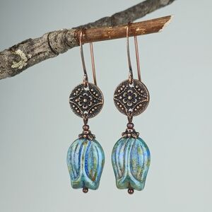 Handcrafted artisan earrings with antiqued copper floral medallions and earthy blue Czech glass tulip drops. Rustic boho, vintage inspired statement—the perfect unique gift. For pierced ears.