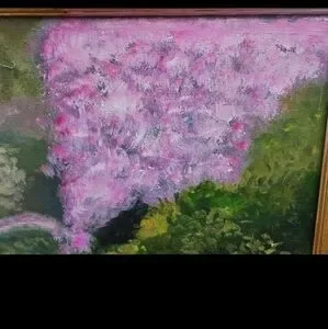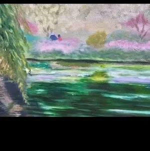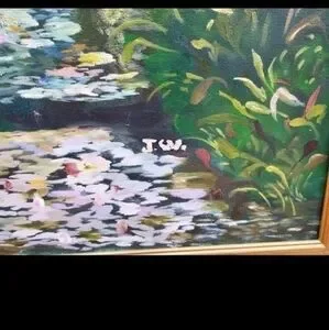 Up for sale is this vintage oil painting of a lily pond. impressionism, realism, beautiful painting in pinks and greens. framed with a narrow gold frame. measures 28" x 26"