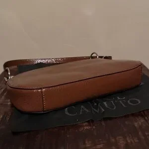 Features a sophisticated toffee caramel brown tone. Comes with chain crossbody strap. Satchel handle has 9” drop, crossbody chain has 26” drop.