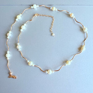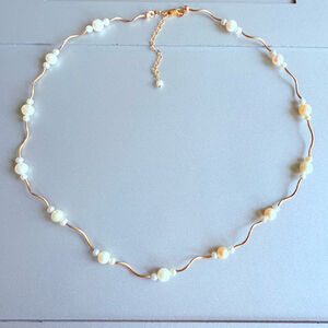 Classy, feminine 14K Solid Gold saltwater cultured pearl necklace. The necklace consists of a 14K gold wavey spiral panel design integrated with a 3-pearl bead cluster. The pattern is repeated all throughout the necklace, with closure being adjustable by 2" to create the desired length, given what length you want to wear it with a certain outfit. 39 pearls total.