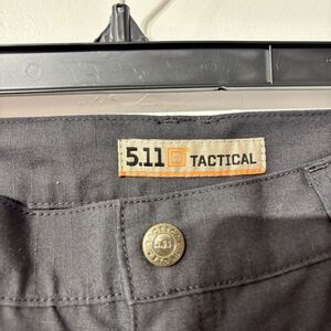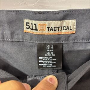 The product is a pair of women's size 16 5.11 Tactical Taclite Pro Ripstop pants in charcoal gray. These lightweight cargo pants feature a mid-rise fit with a 28-inch inseam and a 35-inch waist size. Made from a cotton-polyester blend, they are designed for casual occasions and have straight legs with hook and loop pockets for added convenience. The pants also have a solid pattern, flat front, and are machine washable. Ideal for all seasons, these pants combine classic and modern style with practical features for everyday wear.