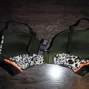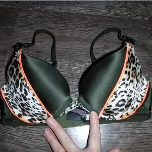Unleash your inner wildcat with this captivating Victoria's Secret bra. The Very Sexy push-up design enhances your natural curves, providing a flattering and confident silhouette. A striking leopard print adorns the cups, contrasted by sleek olive green satin and a vibrant orange trim for a bold and playful touch. Adjustable straps ensure a comfortable and customized fit, while the classic hook-and-eye closure provides secure support. Perfect for adding a touch of daring to your everyday style or for a special night out, this bra is sure to make you feel irresistible.