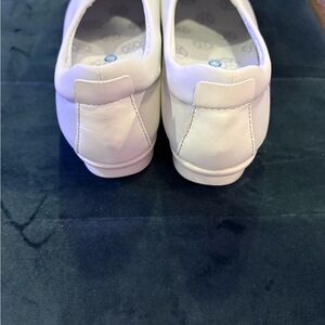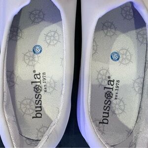 These white shoes are Bussola slip-on shoes featuring a lightweight design, padded footbed, and nautical branding on the insole.
