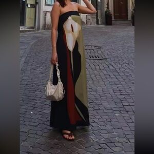 Step out in style with this elegant strapless maxi dress, featuring a stunning front floral design. Perfect for any occasion, this dress combines comfort and sophistication.