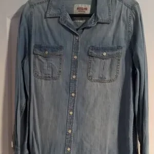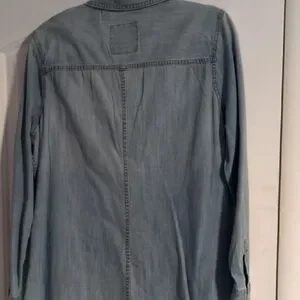 Stylish button-down denim look shirt. Features dual chest pockets. Perfect for casual wear.