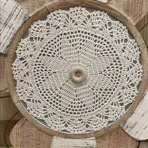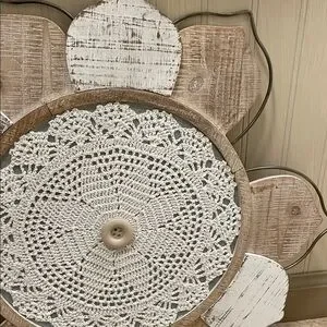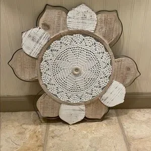 Enhance your home with this wooden farmhouse wall decor featuring a charming lace center. The natural brown tones and white accents create a warm and inviting atmosphere. Perfect for adding a touch of elegance to any room. Measures approximately 20” diameter and in excellent condition coming from clean smoke/pet free home. PLEASE DONT BUNDLE due to extra packaging care.