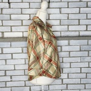 Stylish plaid button-up top for women. Features a blend of red, green, and gold colors. Perfect for casual outings or a day at the office. Please look at the pictures for measurements.