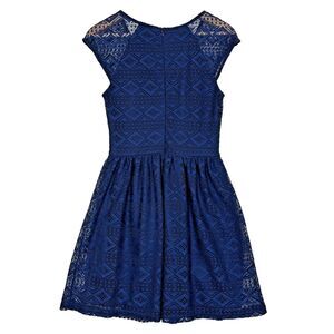 Features: all over lace, fit and flare/a-line, sheer cap sleeve, mini length, zip up back