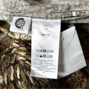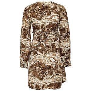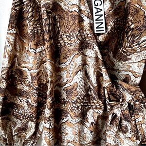 Tiger’s Eye GANNI all-over motif wrap dress in a lightweight and crisp 100% cotton poplin. (GANNI calls this motif Tiger’s Eye, but it is often described as seeming like a snakeskin motif.)