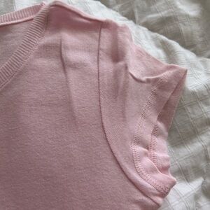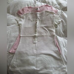 La Senza Vintage (worn 0-1 times) light pink fitted henley T-shirt with cap sleeves. 100% cotton. Bonus white one included (I only wore it 1-2 times but not sure if there is some possible discolouration under the arms). Tag indicates medium but listing as a small which is more in line with the measurements. 15” pit-pit unstretched & 24” length.