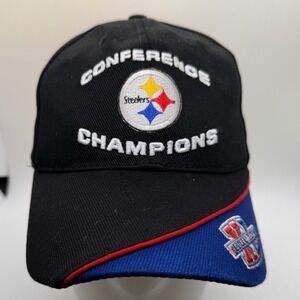 Pittsburgh Steelers NFL Conference Champions hat commemorates the team's victory with bold embroidered graphics. This adjustable cap features a unique two-tone design with a black crown and a blue brim accented by red piping. The front displays the iconic Steelers logo alongside "Conference Champions" text, while the side of the brim includes a Super Bowl XL patch. Constructed with a classic six-panel design and breathable eyelets, it includes a hook-and-loop strap at the back for a customizable fit.