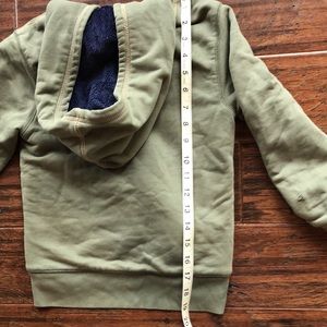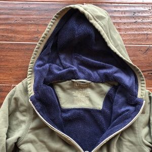 LL BEAN cozy fleece lined zip front hoodie sweatshirt in preowned condition from smoke free home. Olive green with navy blue lining and also cotton lined sleeves for extra warmth and snuggling. This sweatshirt will keep your little one toasty and protected from the elements. Good for a boy or a girl.
