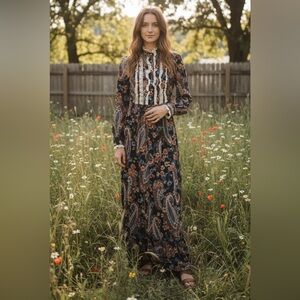 Vintage 1970's 70s Denise L Paisley Lace Prairie Hippie Trim Cotton Maxi Dress