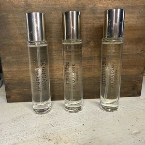 Set of three Jo Malone colognes. Features Wood Sage & Sea Salt, Beach Blossom, and Frangipani Flower. Luxurious and refreshing.