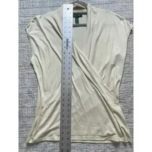 Keywords: Ralph Lauren top, cream draped blouse, womenâs L sleeveless stretch top, viscose elastane