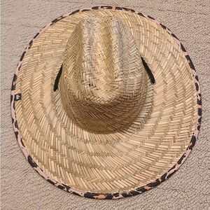 Leopard print. The hat is hand woven and it’s bole leopard pattern and UPF 50+ under brim liner make it functional and fashionable. This hat is new but without tags. Never worn and comes from smoke free and pet free home. It has an adjustable drawstring and is one size adult.