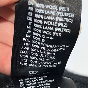 The Valley felt fedora features a traditional brim and a classic dimpled crown. This timeless style is the perfect topper for your weekend look. Black Wool with brown leather band. One size, measures 21.5” around inside of crown. Excellent condition.