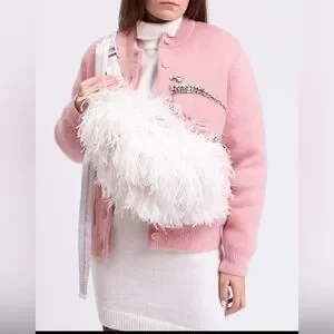 This Off-White large leather and feather-adorned bum bag is a high-end luxury accessory. featuring premium materials, a zipped closure, and authentic Italian craftsmanship. It is designed as a statement piece, blending streetwear aesthetics with distinctive, luxurious textures.
