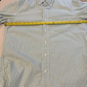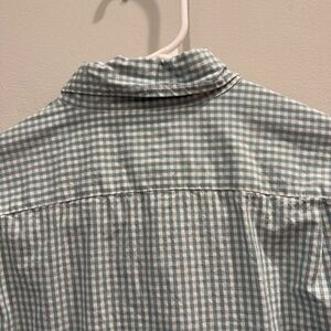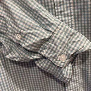 Classic plaid shirt with button-down collar. Features a mix of light green and white. Perfect for casual wear.