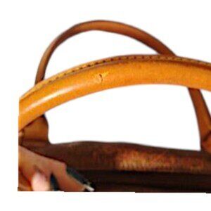 the call-outs are there is a tiny Nick on the handle as shown in the left photo and the inside has some feeling but it is not going through the lining. please ask all questions prior to purchase as I cannot cancel at this time thank you.