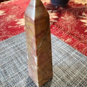Elegant stone obelisk with brown and tan hues. Perfect for home decor or collection.