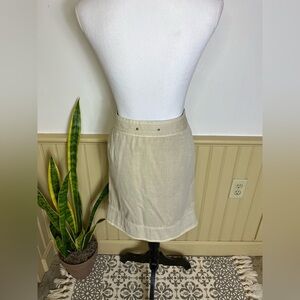 Anthropologie Hei Hei cotton skirt, size 8. Soft beige with a full button front, scalloped hem, and red contrast stitching at the buttons. A lovely feminine silhouette, with a lightweight feel and handy side pockets. This piece is easy to style — try it with a ruffled blouse and sandals for brunch, or a simple ribbed tank and mules for a chic, casual day out. Made in the USA. Waist: 15” flat. Length: 21”. Excellent condition.