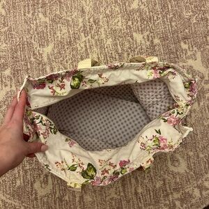Charming tote with floral pattern. Ideal for everyday use or overnight bag. Discoloration on handles and zipper pull, small pen mark on back, otherwise structure of the bag is in great condition! Tons of use left.