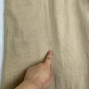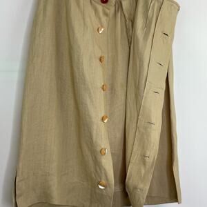 In good preowned condition, small spot on back as pointed out in pictures. No fabric tag, appears to be linen. Button down midi skirt with back pockets. See measurements in pictures. Neutral, minimalist, earthy, tan, vintage inspired, school, academia, office, career, European.
