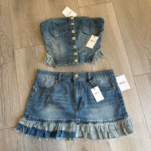 NWT Womens Blue Denim 2 piece Set. Raw Hem. Western. Skirt Size M, Top Size S