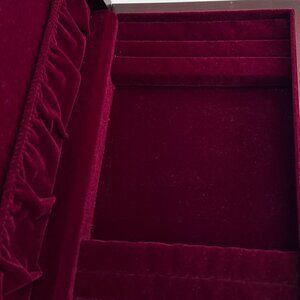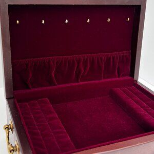 Classic, streamlined, and made in the USA, this Eureka Manufacturing Company / Reed & Barton jewelry chest is made of solid wood and lined with burgundy velvet. Light wear, commensurate with age. Some dings on edges and top and a few light speckles on the front (shown in pictures). The burgundy velvet interior is free from marks or stains; it's clean, and ready to store and display your treasures! Great vintage condition overall.