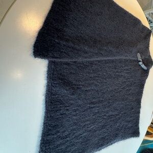 This is a preowned women's Eileen Fisher Black wool cape with a Leather strap for closure. It is a One Size piece item. The photos show the front and the back. It is cozy, minimal clothing that is effortless, elegant and comfortable.