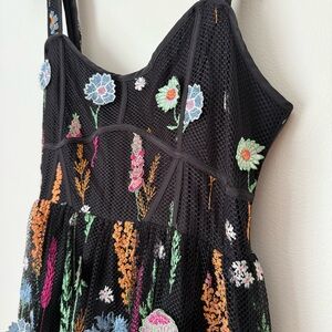 Gorgeous maxi dress that will turn heads at any party. The black mesh outer layer is embroidered in colorful florals. Fully lined, you will not be exposed.