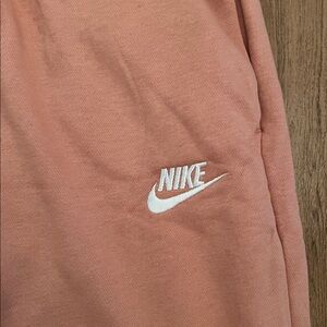 Nike sweatpants with a mid-rise elastic waistband and side pockets. Embroidered logo. Lined with brushed fleece. Elastic cuffs. Oversized fit. Inseam approx 30”. Rose gold. Sold out color! New with tags!