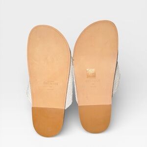 These sandals feature the brand's signature bow detailing reimagined in a woven leather construction. They have a leather insole and a low, comfortable sole for all-day wear.