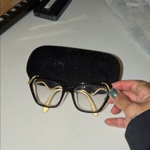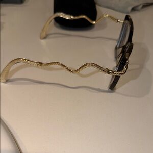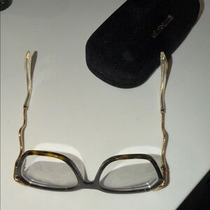 Elegant geometric prescription eyeglasses with black frames and gold accents. Includes a branded case. And unused cloth.