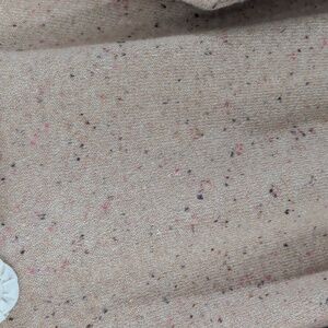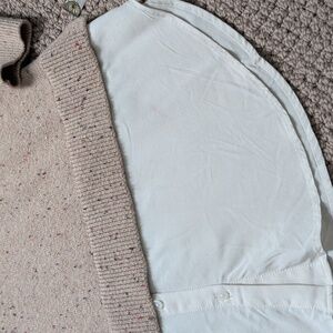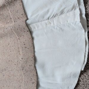 Stylish beige speckled sweater featuring a beige collar with tiny ruffle and longer shirt hanging below sweater hem. Perfect for a chic layered look.