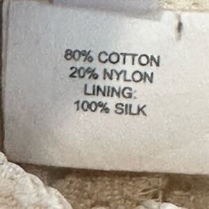 Material: Shell: 80% Cotton, 20% Nylon; Lining: 100% Silk