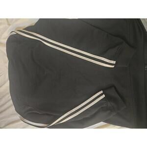 Black Adidas track jacket featuring white stripes along the sleeves.