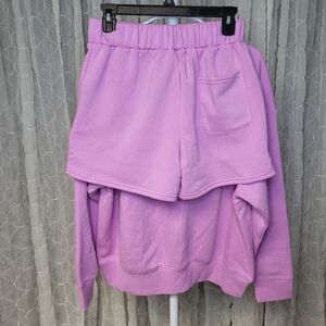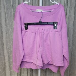 Color/Pattern- mauve purple. fleace boat neck sweatshirt and shorts with pockets
