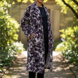 Stylish velvet coat with a bold floral design. Features rich purple tones. Lightweight and lined.