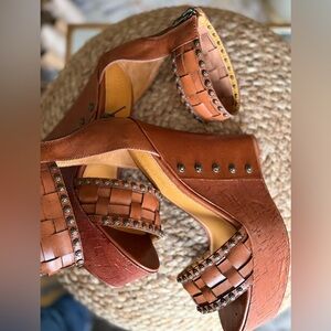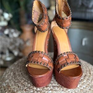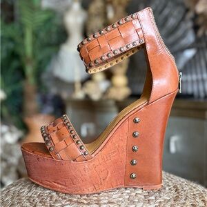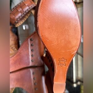 Cognac leather Studded Tan Wedge Sandals ankle strap boho western woven wedges