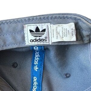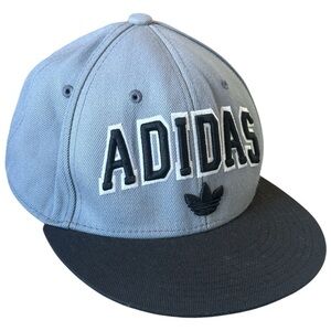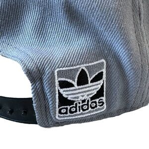 This 2012 Adidas Trefoil Wool Blend Snapback Cap with 3D Embroidery in Grey/Black is One Size Fits All. In good condition, as pictured; call-out for faint discoloration at the interior sweatband.