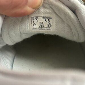 Vans Old Skool Stacked Shoe in all white with brown lug gum sole. Women's size 8.5. Used—scuffs, wear, and dirt as shown.